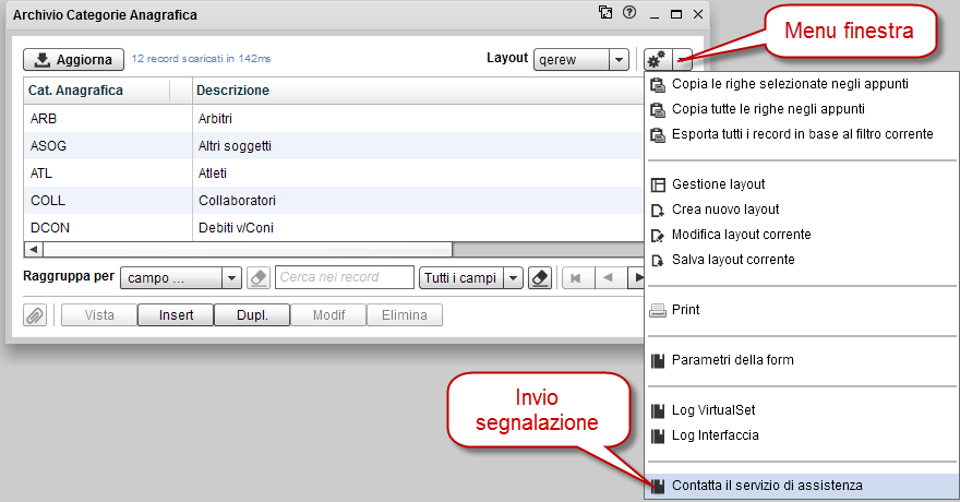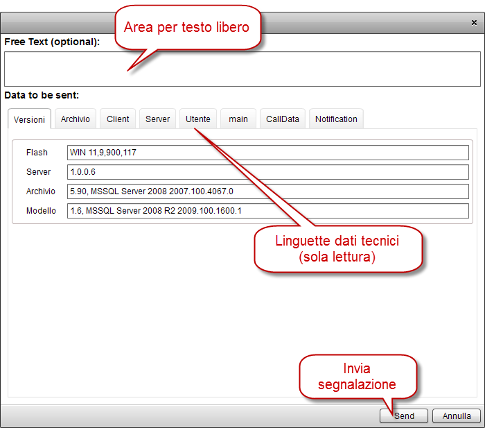 La funzione è disponibile su qualunque interfaccia delle applicazioni, all’interno del menu della finestra: comprende un’area per la digitazione di testo libero da parte dell’utente e di una serie di tab che evidenziano (in sola lettura) le informazioni che saranno inviate al server. I dati personali, quali le password sono oscurate e non inviate al server. La funzione è disponibile anche nelle maschere dei messaggi, e risulta particolarmente utile per inviare un gran numero di informazioni tecniche al centro assistenza in presenza di errori dell'applicazione o anomalie.