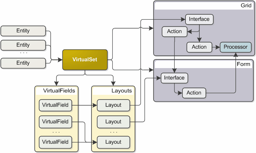 - VirtualSets. Sono gli oggetti di business veri e propri, che contengono le informazioni trattate dal sistema. Possono essere basati su dati persistenti (entities aggiornabili), dei quali definiscono relazioni e proprietà (campi), su dati non persistenti (viste non aggiornabili o selezioni definite dall’utente), su definizioni di struttura (descriptor) utili alla sola raccolta dati da interfaccia. I virtualset definiscono le caratteristiche fondamentali delle singole informazioni, denominate VirtualFields, relativamente alle proprietà elementari (nome, formato, tipo, regole di aggiornamento), quelle di interfaccia (modalità di rappresentazione/input) e comportamento specifico (progressività, nullabilità …).