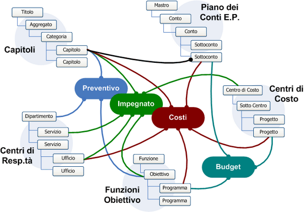 La configurazione dell'esempio nello schema è la seguente : nel preventivo finanziario intervengono i capitoli (4° livello), i centri di resp.tà di 1° livello, le funzioni-obiettivo (2° livello); relativamente all'impegnato i centri di resp.tà vengono dettagliati fino al servizio (2° livello) in alcuni casi, e fino all'ufficio (3° livello) in altri, insieme ai centri di costo (1° livello) ed alle funzioni obiettivo (2° livello, come il preventivo); per il calcolo dei costi intervengono i progetti (3° livello dei centri di costo), i programmi (3° livello delle funzioni-obiettivo), gli uffici (3° livello dei centri di resp.tà), nonchè i sottoconti del bilancio economico; il budget è ottenuto per incrocio dei progetti e dei programmi, per ciascun sottoconto economico. E' importante sottolineare che il numero dei livelli disponibili ed i termini impiegati per ciascun elemento sono a totale discrezione dell'ente.